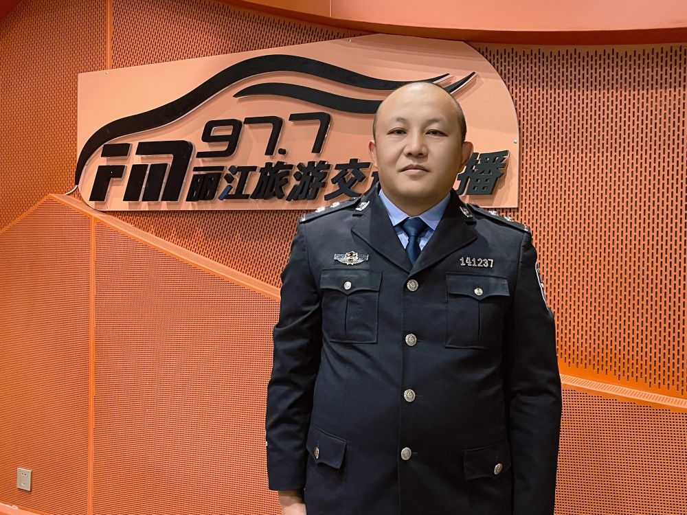 12月3日,丽江市公安局交通管理支队民警瞿春友走进FM97.7丽江旅游交通广播直播间。(丽江融媒记者 徐蕾 摄)