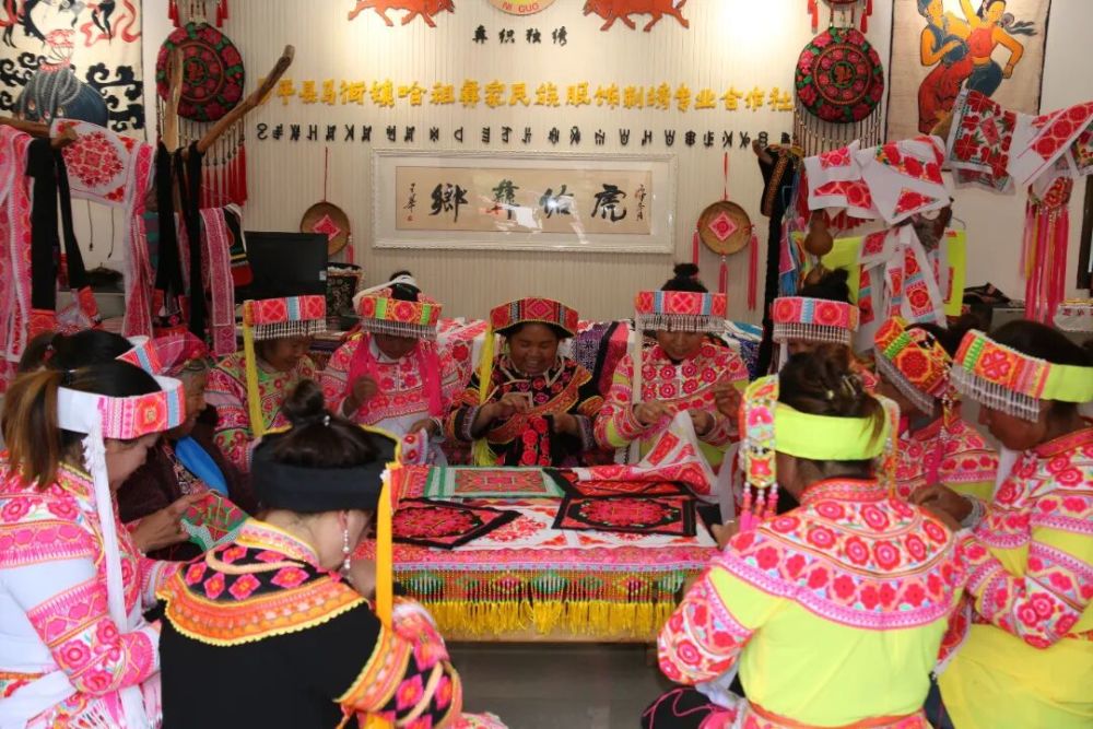 在杨聪粉的带动下,村寨里越来越多的彝族妇女加入了刺绣队伍。2019年,马街镇依托鲁基村委会浓郁的民族风情,丰富的彝族服饰刺绣文化,成立了罗平县马街镇哈租彝家民族服饰刺绣专业合作社,注册完成彝族服饰商标“尼帼牌”,2024年,彝家刺绣成功申报罗平县级非物质文化遗产。合作社辐射带动50余名彝族妇女成为专职“绣娘”,通过订单生产实现年销售额突破20万元,让非遗技艺转化为“指尖经济”。