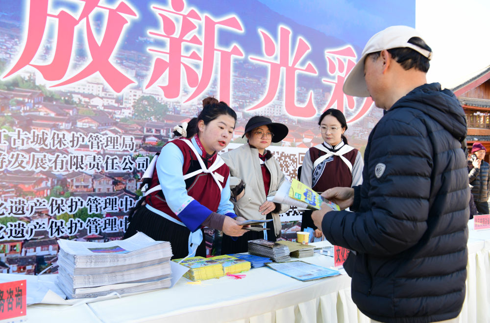 工作人员向游客发放宣传资料。(丽江融媒记者 赵庆祖 摄)