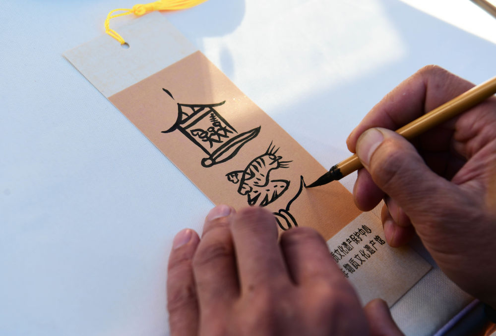 非遗代表性传承人在给游客书写东巴文书签。(丽江融媒记者 赵庆祖 摄)