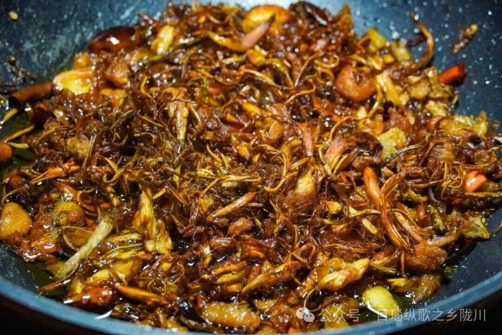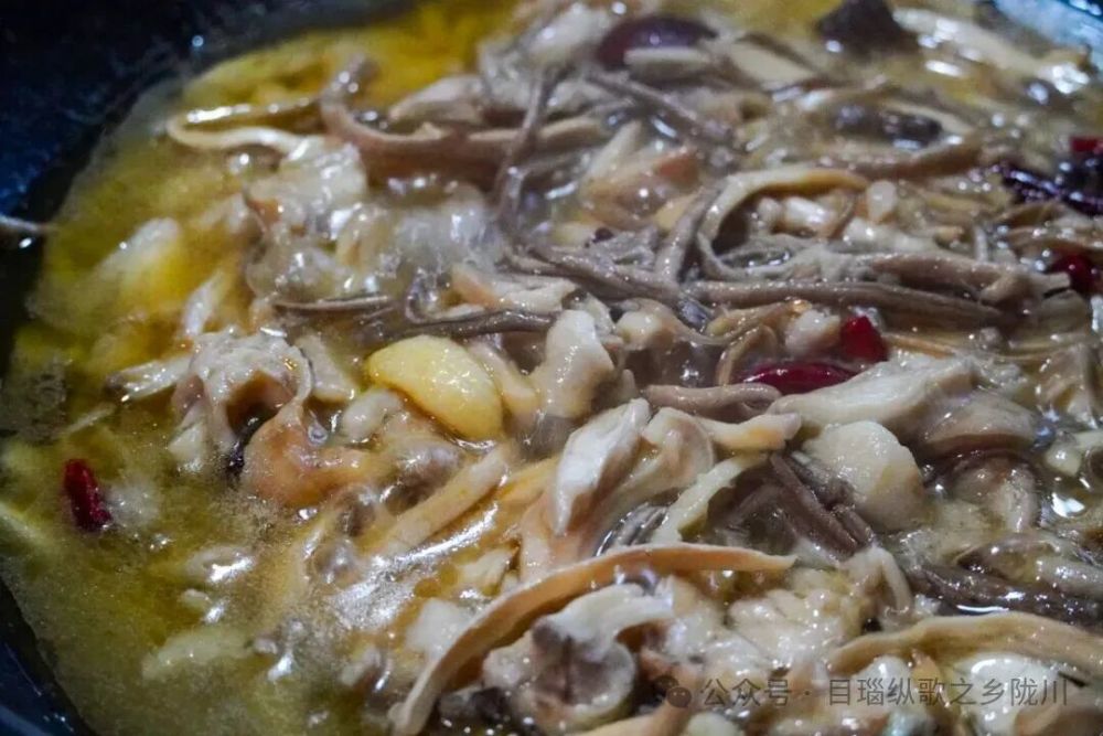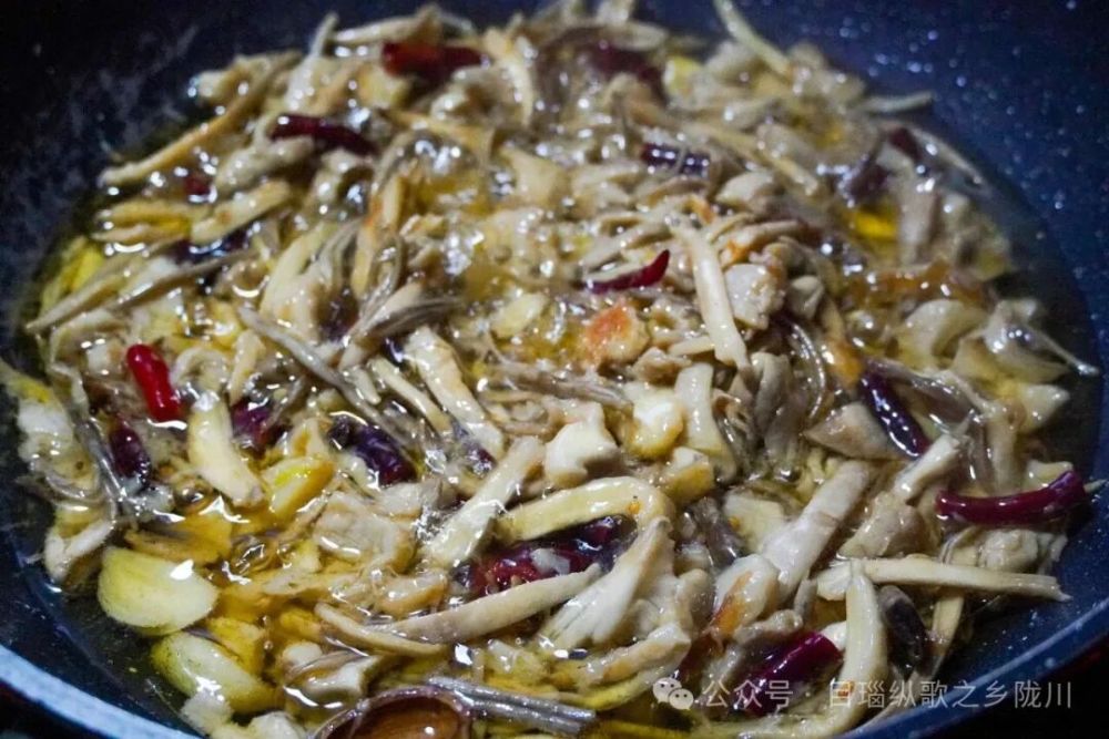 热锅冷油,待油温微升,加入大蒜、掰开的草果和干辣椒,将再撕好的鸡纵菌下入锅中,小火慢炸,让菌子的水分慢慢收干,香气层层释放。此时香料的辛香与鸡纵的鲜香相互交融,在热油中翻涌升腾。
