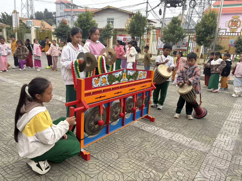 当象脚鼓的乐声在操场响起,一场独具民族特色的大课间开始了。由排芒、象脚鼓和镲组成的演奏声中,孩子们欢快地跳起传统舞蹈。SeinPhyo和Yi也情不自禁加入其中,与孩子们一同起舞。