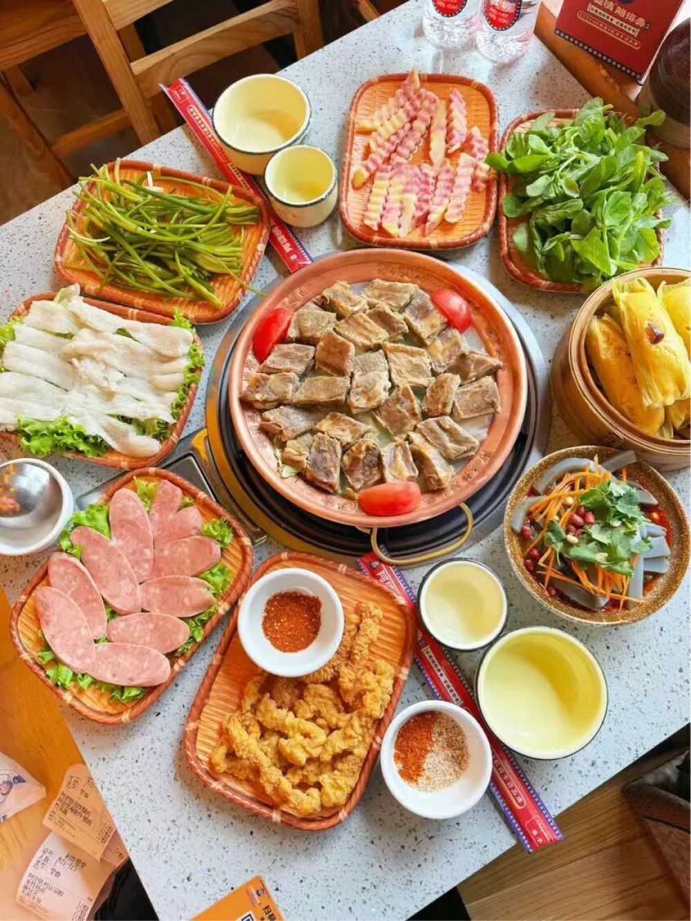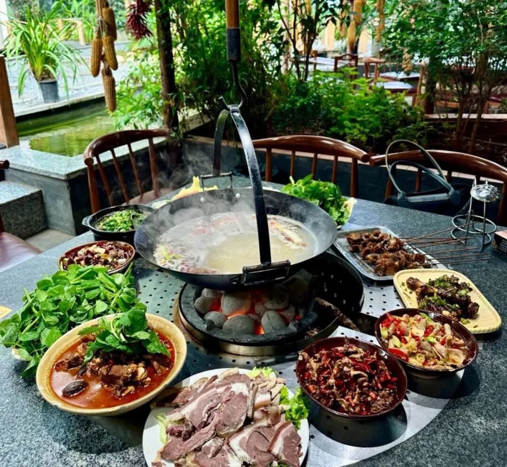 纳西铜锅正对着火塘烧!腊排骨、酥肉、洋芋层层码满,炭火越烤越鲜,你们“默契配合”拼完胜负,火塘边围坐一圈,不分你我涮着吃,刚才的“边路突破”“中场绞杀”,边吃边唠越唠越投机。