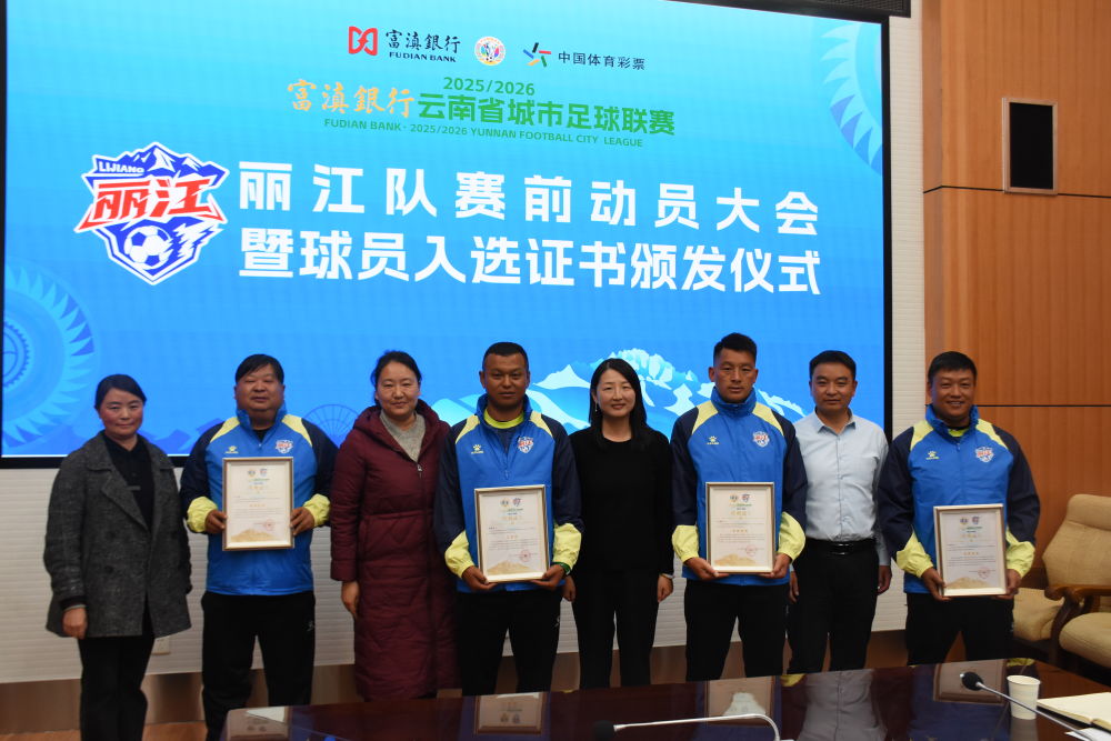 副市长魏妮娅为滇超联赛丽江队运动员、教练员颁发入选证书。(丽江融媒记者 解俊 摄)