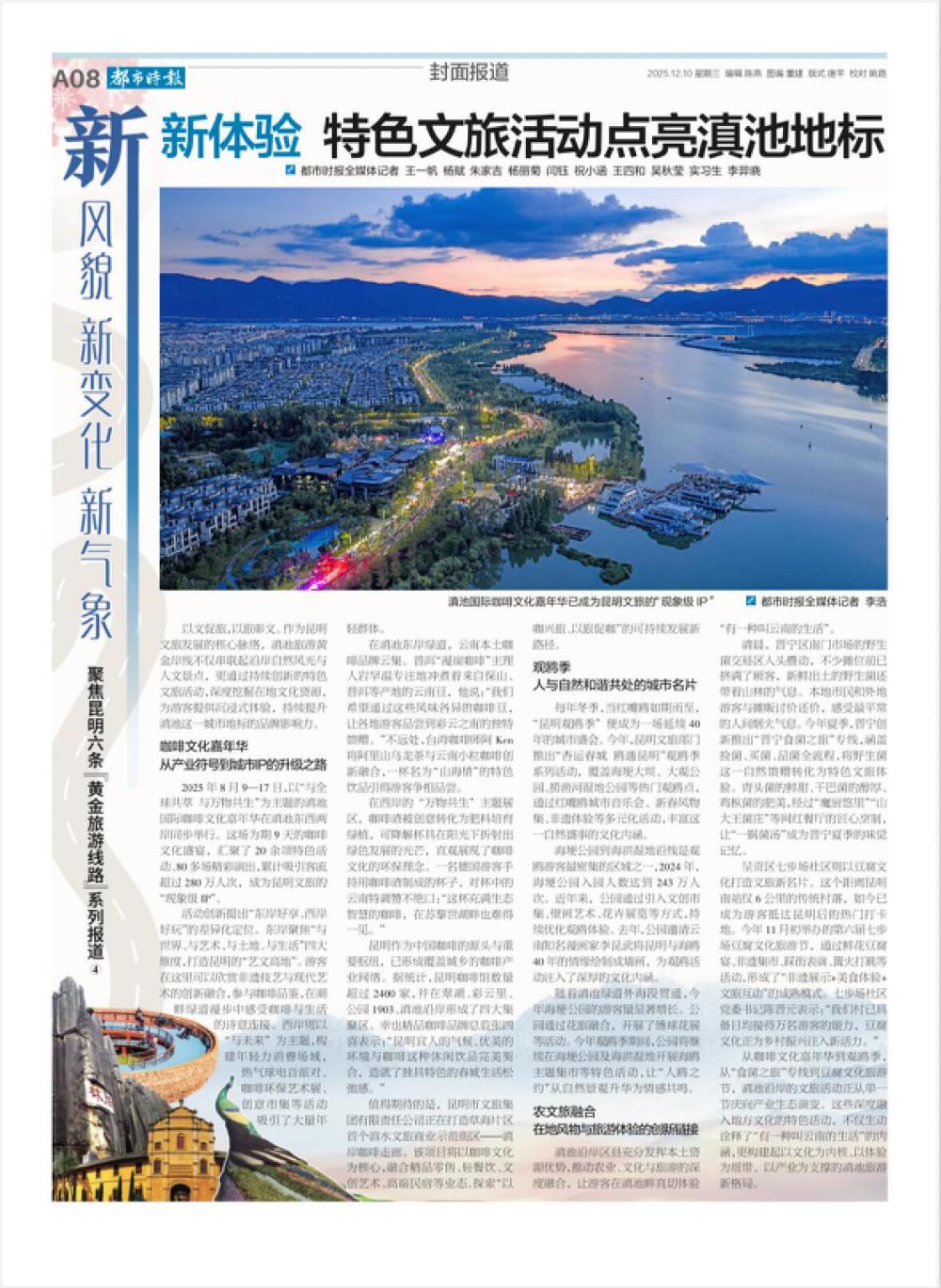 从咖啡文化嘉年华到观鸥季,从“食菌之旅”专线到豆腐文化旅游节,滇池沿岸的文旅活动正从单一节庆向产业生态演变。这些深度融入地方文化的特色活动,不仅生动诠释了“有一种叫云南的生活”的内涵,更构建起以文化为内核、以体验为纽带、以产业为支撑的滇池旅游新格局。