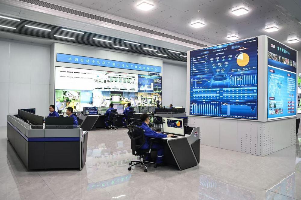 △工作人员在鞍钢集团所属的本钢板材冷轧总厂第三冷轧厂集控中心监控设备运行情况。