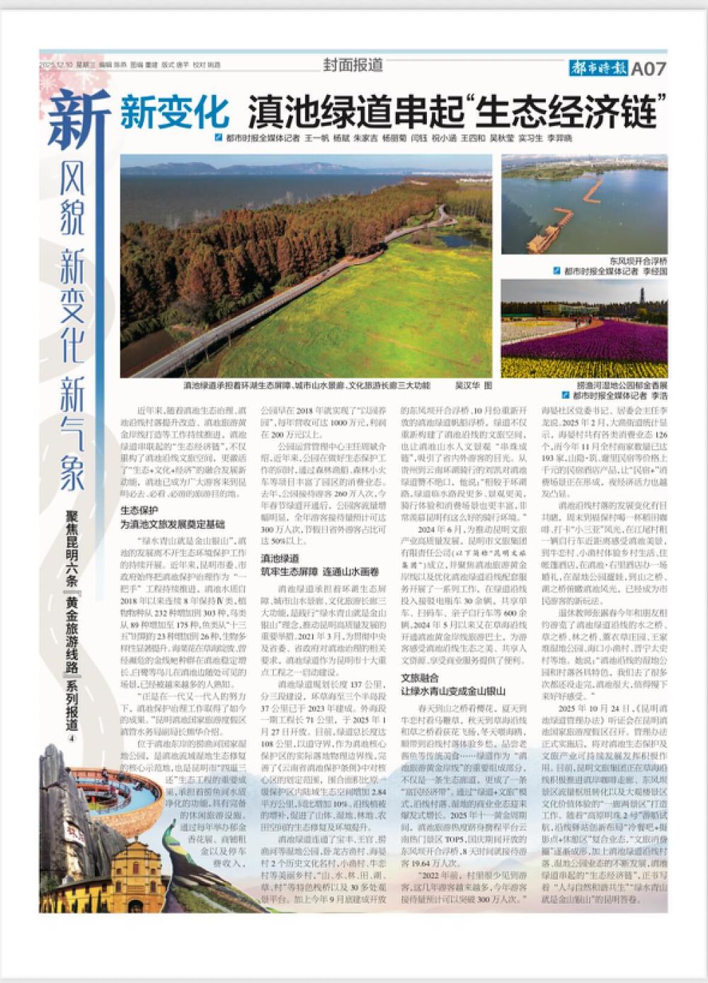近年来,随着滇池生态治理、滇池沿线村落提升改造、滇池旅游黄金岸线打造等工作持续推进,滇池绿道串联起的“生态经济链”,不仅重构了滇池沿线文旅空间,更激活了“生态+文化+经济”的融合发展新动能,滇池已成为广大游客来到昆明必去、必看、必游的旅游目的地。
