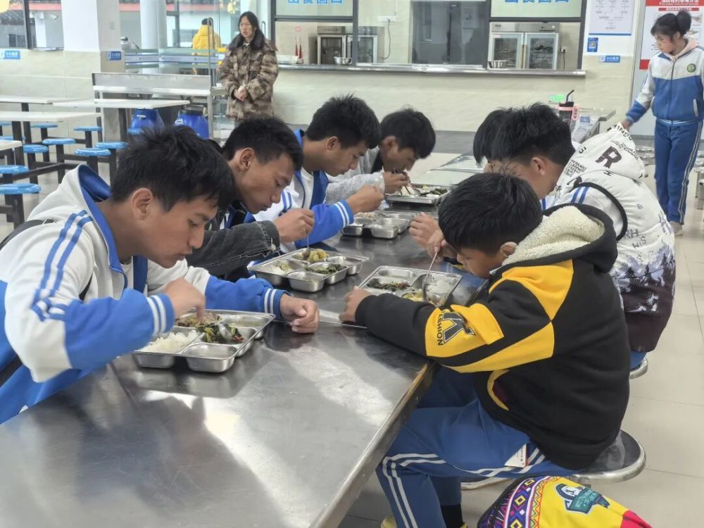 队员们在学校食堂吃晚餐。(丽江融媒记者 侯玮 摄)