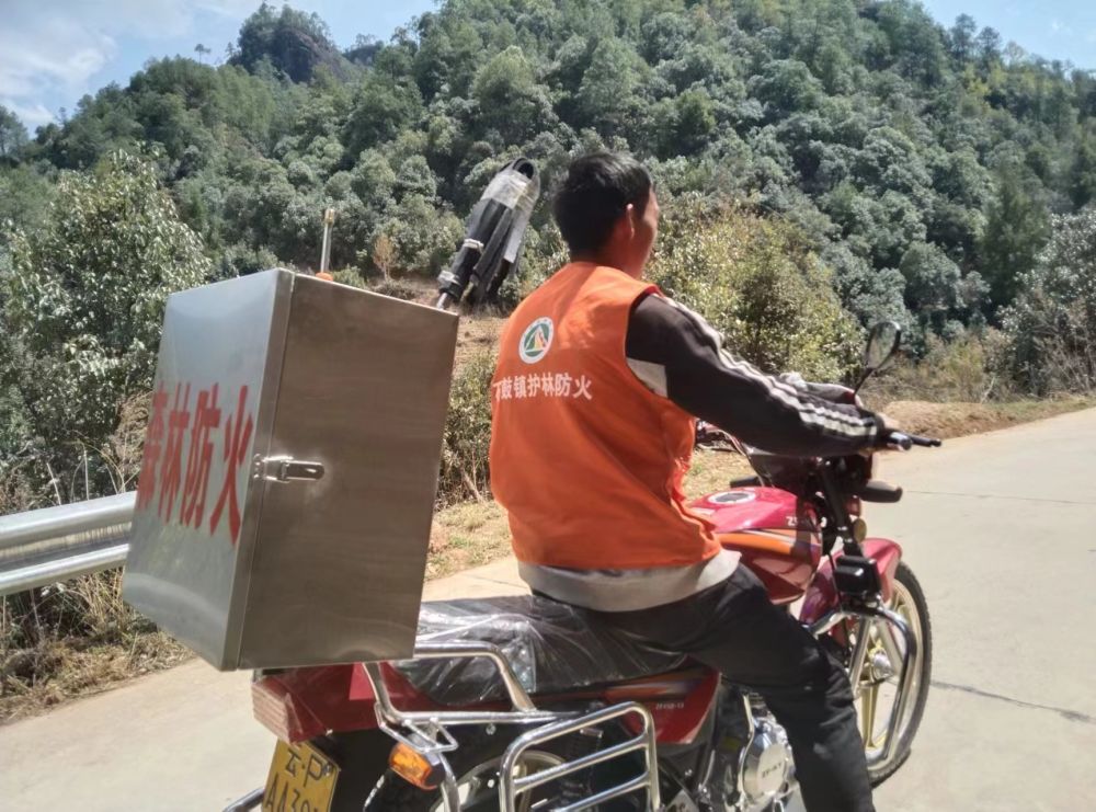 初发火处置人员骑摩托车在林区开展巡护和宣传。(市林草局供图)