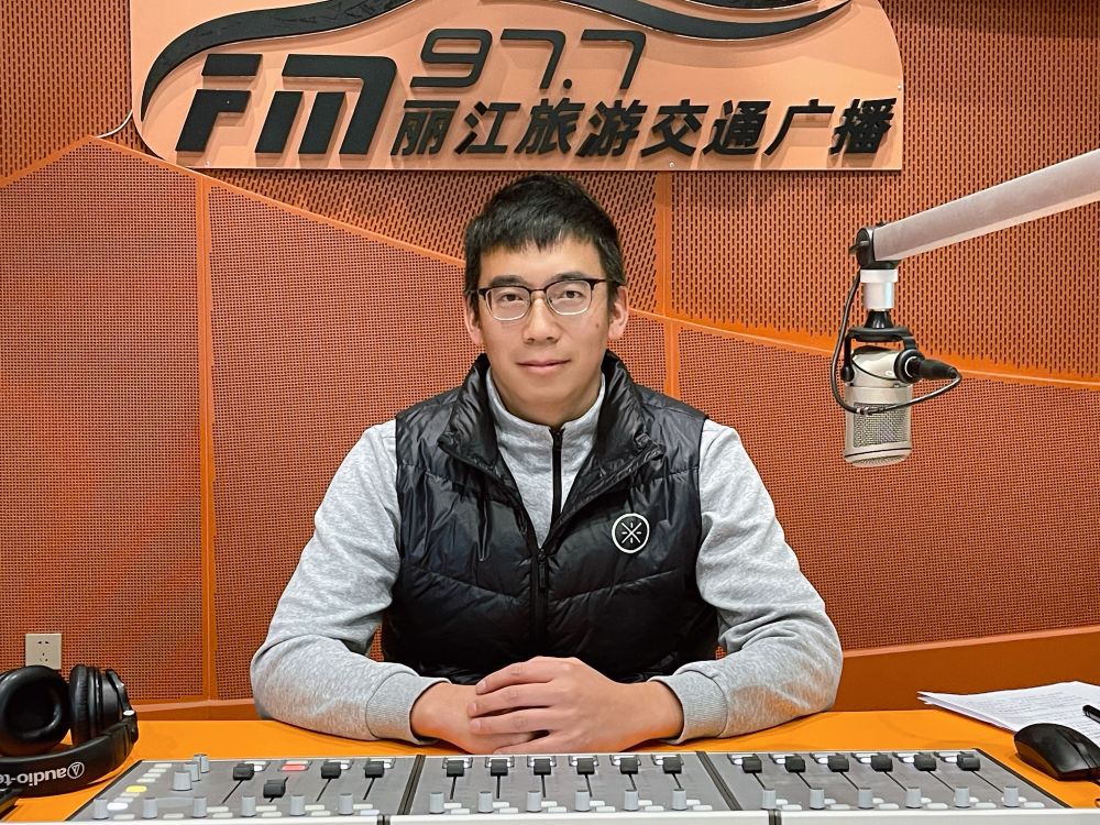 12月11日,丽江市林业和草原局防火科科长 和兴旺 走进FM97.7丽江旅游交通广播直播间。(丽江融媒记者 徐蕾 摄)