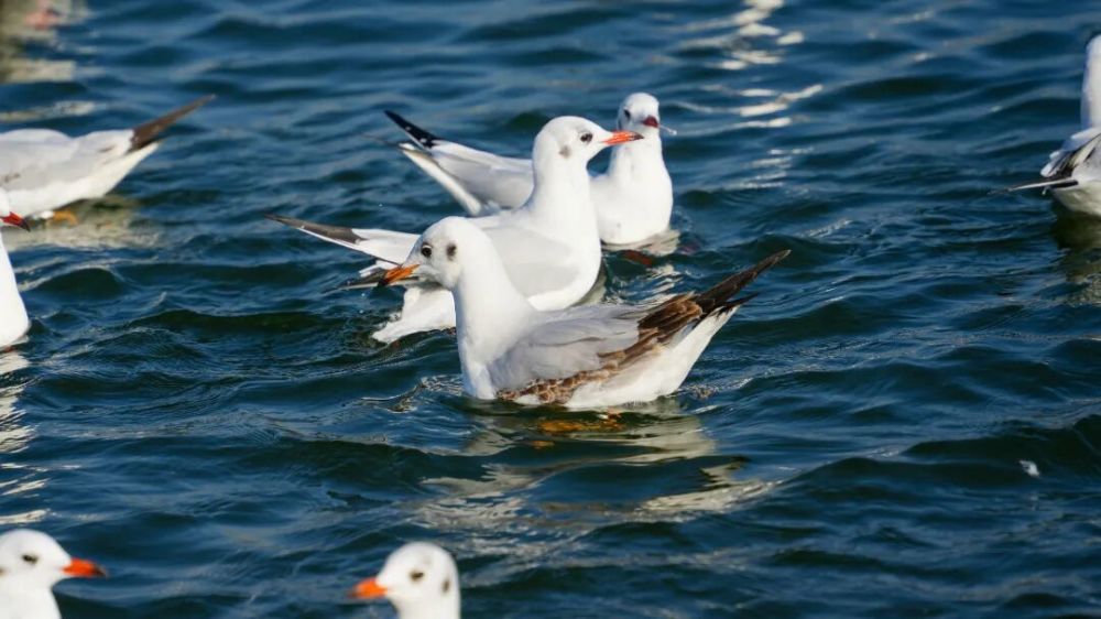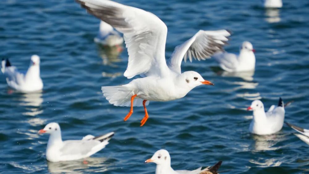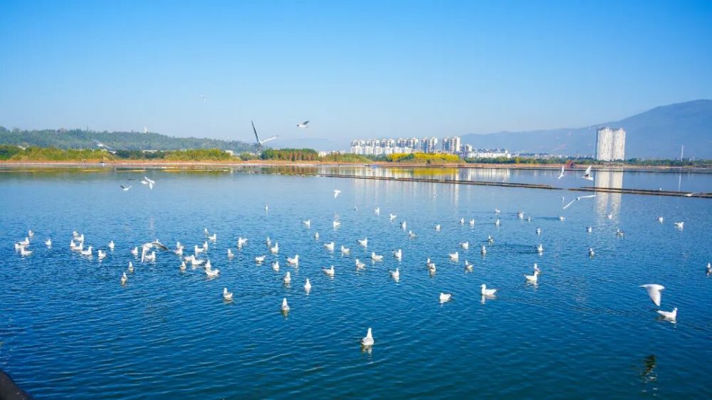 成群的红嘴鸥或在碧蓝湖面上空盘旋滑翔