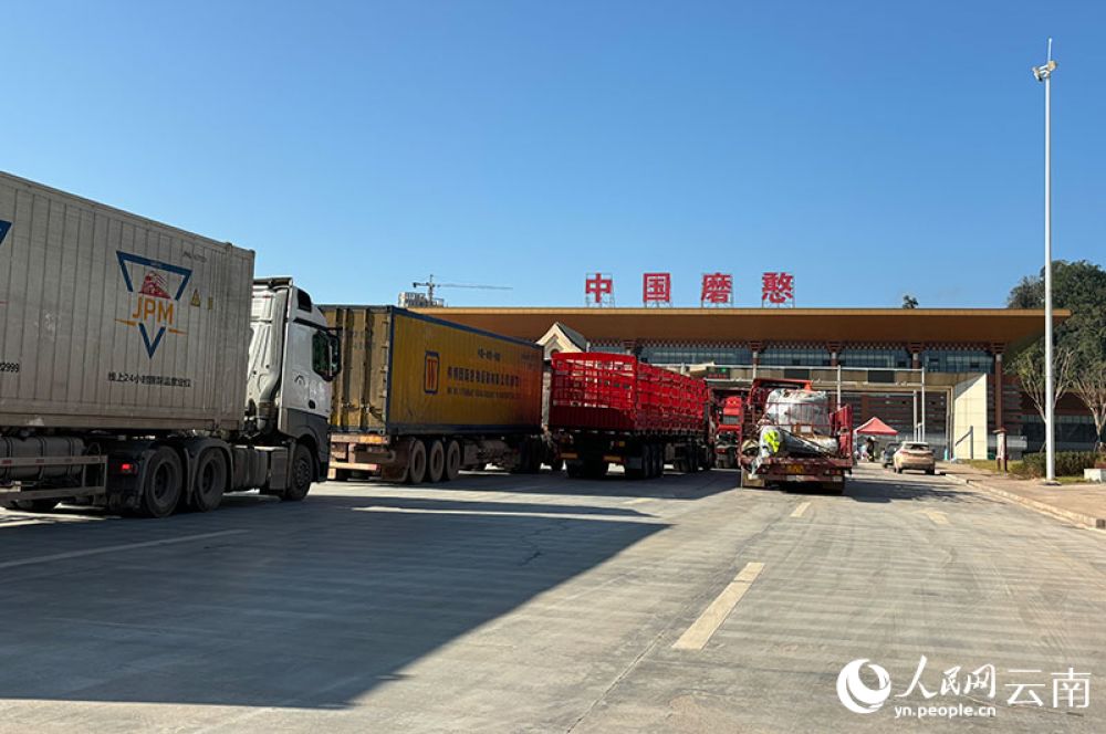 货车在磨憨口岸排队通关。人民网 雷霁摄
