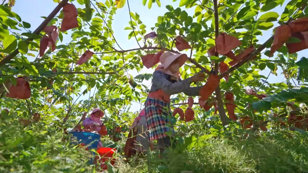冬日暖阳下,云南省元江哈尼族彝族傣族自治县干热河谷的万亩释迦果迎来丰收季,果农穿梭林间采摘,电商直播间订单不断。