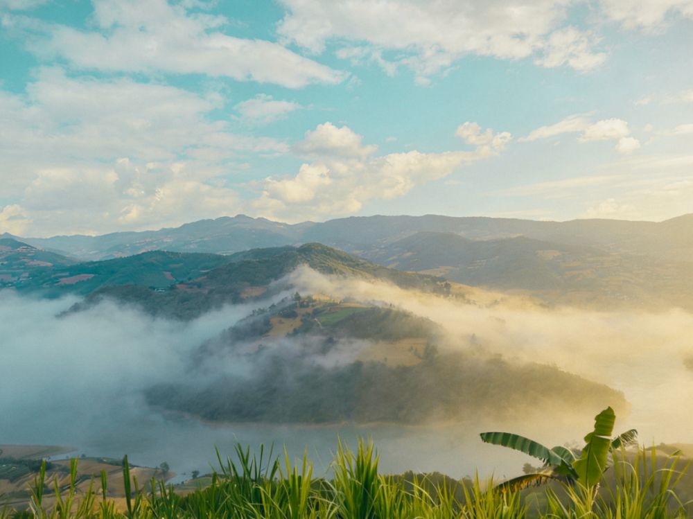 风拂过时,云絮轻擦山峦