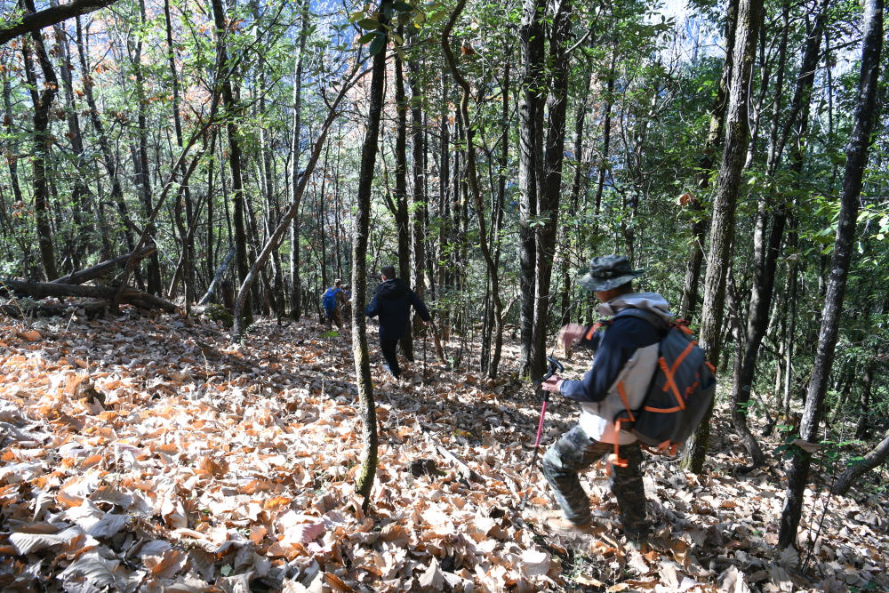 玉龙雪山省级自然保护区管护局工作人员行走在玉龙县大具乡的山上。(丽江融媒记者 赵庆祖 摄)