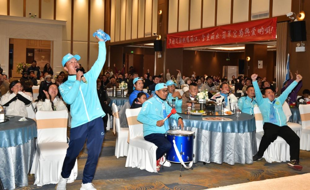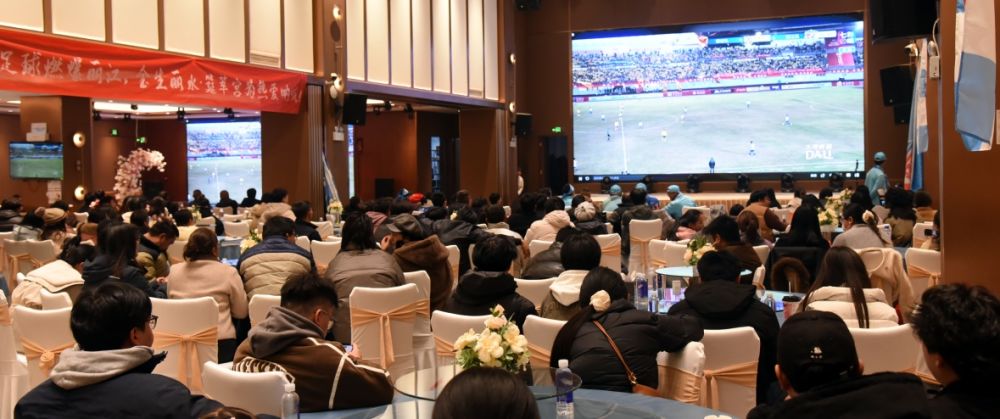 当天,丽江的各大商场大屏幕同步直播了比赛,吸引了众多市民驻足观看。与此同时,丽江的企业也积极行动起来,为球迷们提供了温馨的观赛场所。其中,丽江金生丽水筵萃宫餐厅免费开放宴会厅,约300名球迷齐聚于此,共同为丽江队加油助威。活动现场由身着球迷服装的丽江市球迷协会成员引领,激情的鼓点、响亮的口号与赛场同步,仪式感十足,热情丝毫不逊于现场观赛。