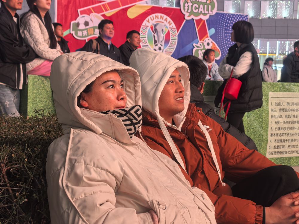 祥和商业广场中心,球迷们在电子大屏下观看球赛直播。(丽江融媒记者 侯玮 摄)