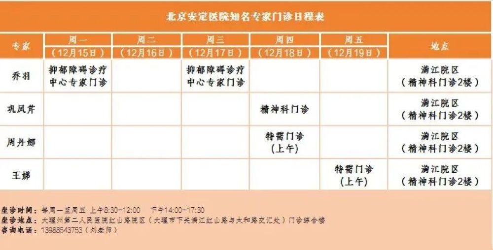为了方便广大人民群众就医,满足大理州及周边州(市)患者就医需求,12月15日至19日,北京安定医院专家到大理州第二人民医院坐诊,患者可通过“大理州第二人民医院”微信公众号、电话预约挂号。