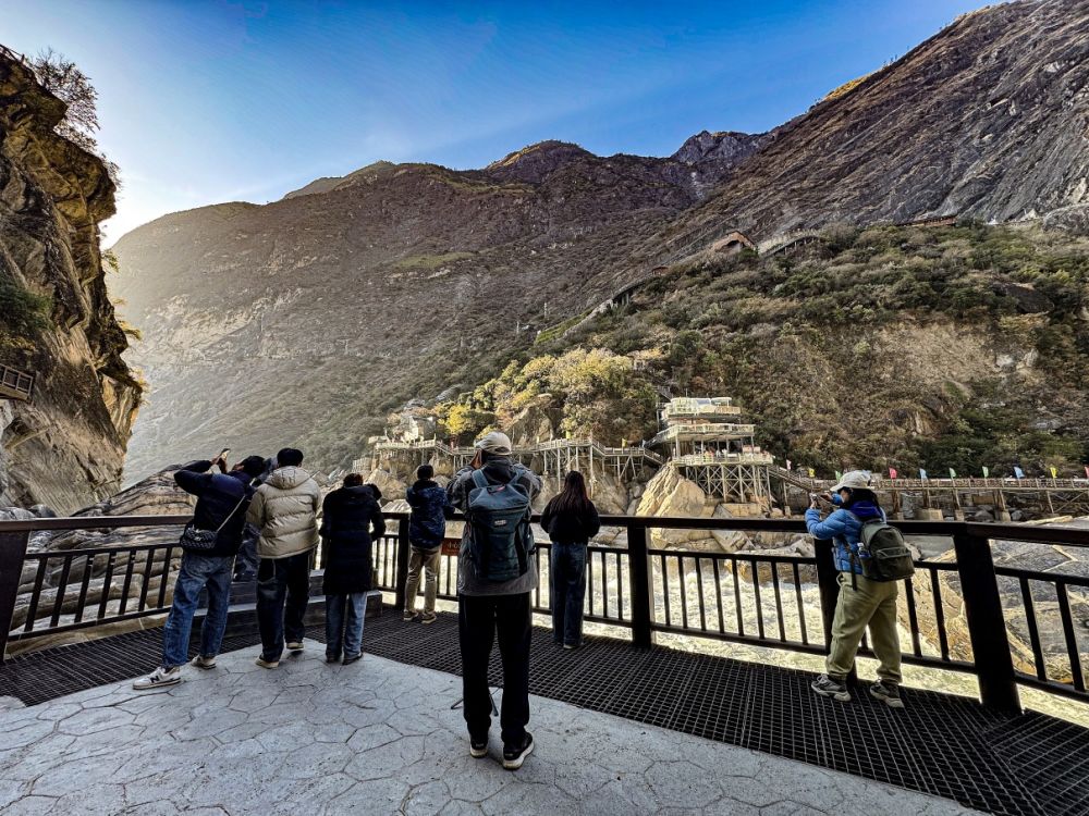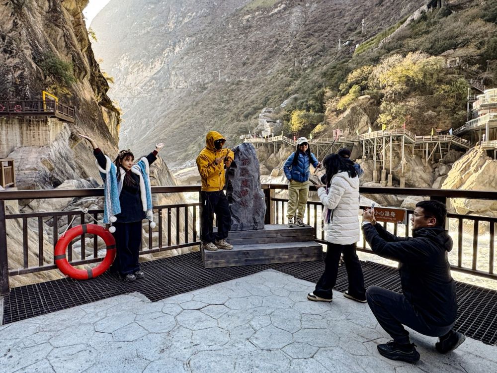 12月21日,游客在丽江虎跳峡观景台拍照留念。(丽江融媒记者 吴星 摄)