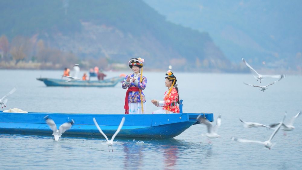 游客乘猪槽船与海鸥嬉戏。(宁蒗融媒记者 朱晓龙 摄)