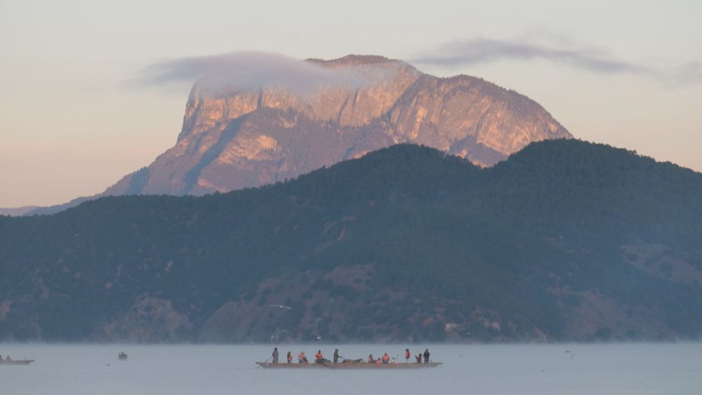 10点,笼罩湖面的晨雾逐渐消散,朝阳为格姆女神山披上琥珀色的光晕。在里格半岛观景台,不少摄影爱好者专程来此捕捉奇景。“这个美景太震撼了,我下次还要带着家人朋友来泸沽湖。”澳门游客王先生说。