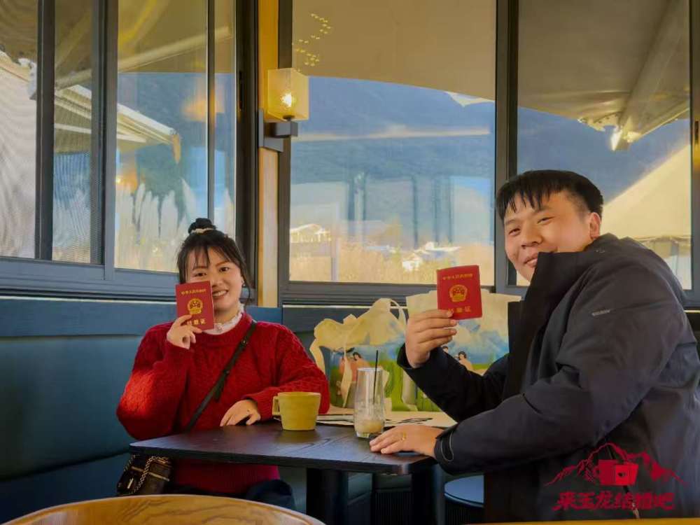 新人在雪山下咖啡馆登记领证结婚。(玉龙县民政局 供图)