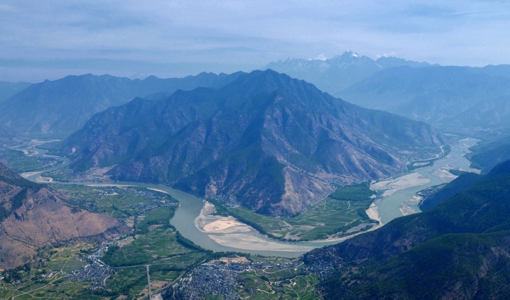 直升机航拍长江第一湾。(丽江融媒记者 和玉松 摄)