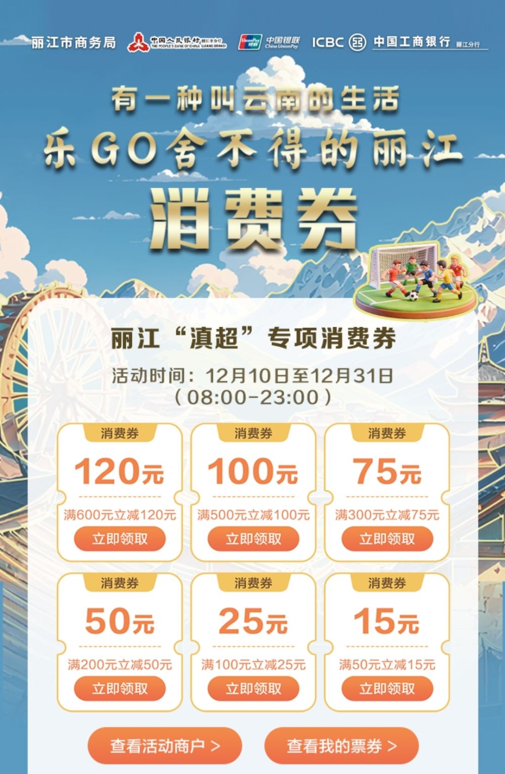 滇超联赛丽江赛区已于12月开赛,这场备受瞩目的体育赛事,成为激活丽江冬季消费市场的重要契机。丽江市商务局把握“体育+消费”融合发展趋势,以赛事为纽带,精心策划推出5大类消费券,串联起赛场周边商圈与全市核心消费场景,成功将赛事的“观赛热度”转化为拉动经济的“消费动能”。从12月初至12月底,覆盖滇超赛事关键周期与居民、游客的消费高频时段,全方位满足不同群体的消费需求。