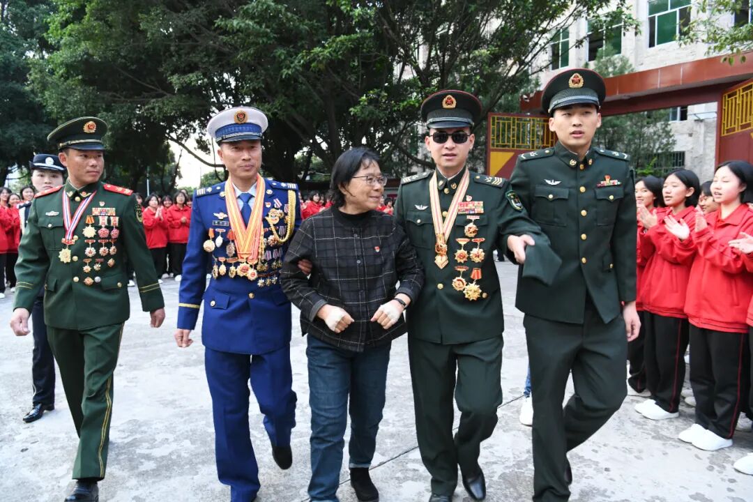 镜头定格下感人的一幕:当“八一勋章”获得者、“时代楷模”、全国道德模范杜富国鼓掌致意时,张桂梅立即上前,用贴满膏药的双手轻轻搀扶住他的右臂,瞬间眼眶湿润——这是英雄之间的相惜,亦是信仰的共鸣。这一刻,山河为功勋见证。