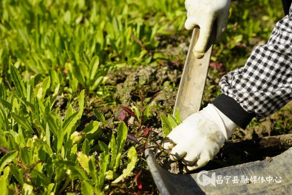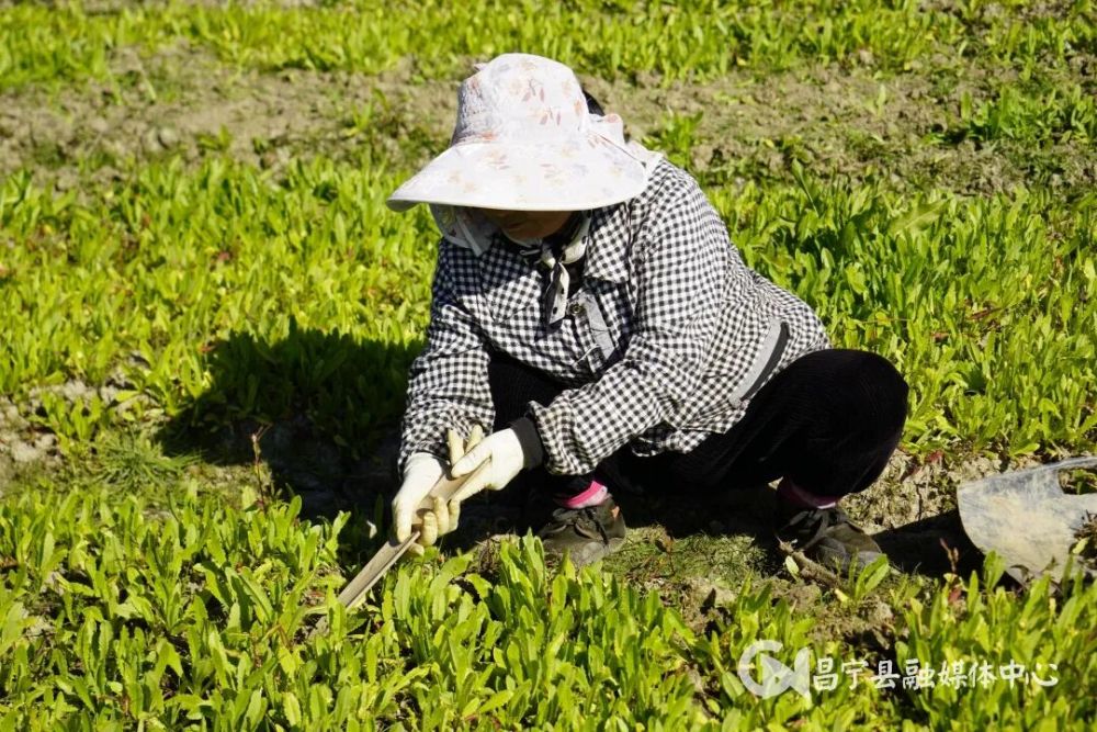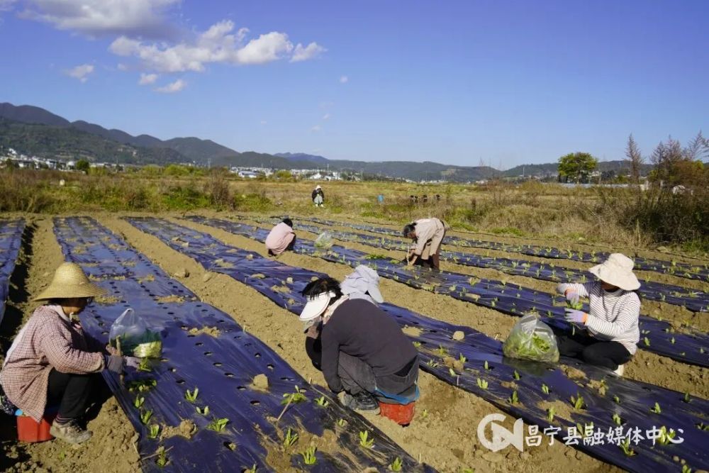 种植基地里,大家分工明确、配合默契,有的拔苗,有的运苗,有的铺膜,有的栽种,既熟练、又有序,每个人都干劲十足。一行行、一列列新栽的贡菜苗横竖成线、整齐划一,在阳光下舒展着嫩叶,承载着丰收的希望。