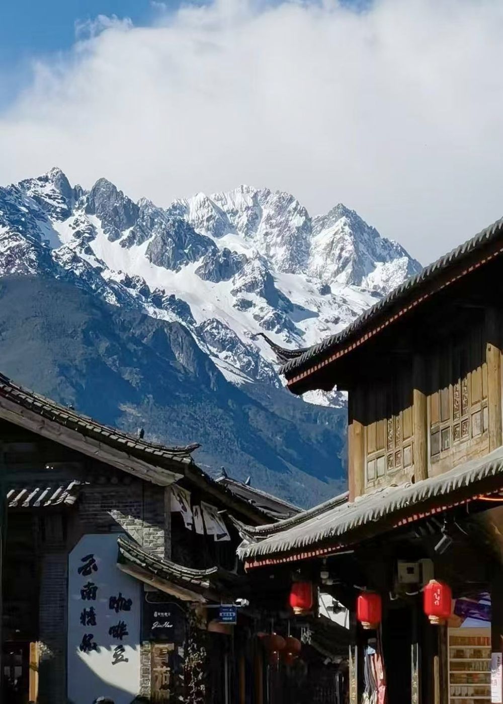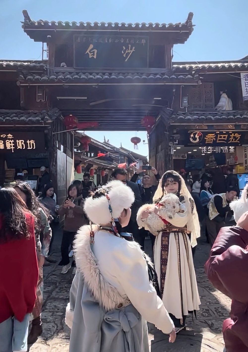 穿过一座仿古牌坊,便踏入了白沙古镇。主街蜿蜒向前,串联起一座座留存岁月痕迹的纳西传统院落。尽管寒意渐浓,古镇内却游人如织,游客们或裹着披肩驻足街口,远眺巍峨雪山的壮丽轮廓;或漫步于略带原生态的街巷,探访零星分布的咖啡馆、手工扎染坊与铜器铺,感受沉淀其中的纳西文化底蕴与当代匠心情怀;更多人则早早预订好直面雪山的民宿,只为静待一场与“日照金山”和漫天星河的浪漫邂逅。