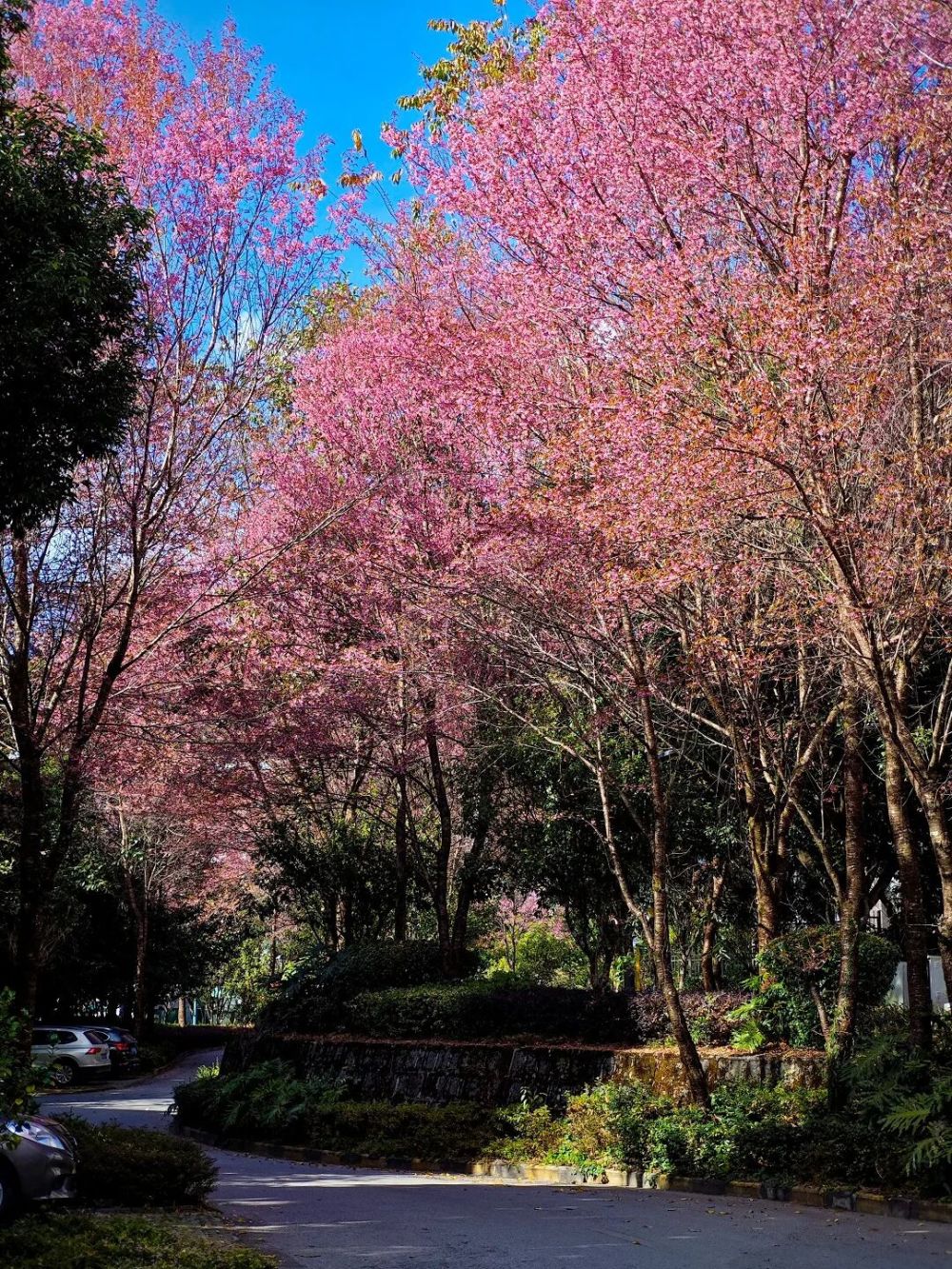 而暖冬里的腾冲,最惊艳的莫过于那一抹绚烂的粉——冬樱花悄然绽放,将这座小城装点得如梦似幻。在和顺古镇的巷陌间,在大牛场的步道旁,在乡间的田埂上,一树树冬樱花迎着暖阳肆意盛开。粉白的花瓣层层叠叠,像云朵落在枝头,微风一吹,花瓣簌簌飘落,铺就一条浪漫的 “樱花大道”。漫步其中,头顶是花团锦簇,脚下是落英缤纷,偶尔有鸟儿在枝头啼鸣,清脆的歌声与烂漫的樱花相映成趣。抬眼望去,远处的火山若隐若现,近处的樱花如云似霞,古朴的民居错落有致,构成一幅绝美的冬日画卷。