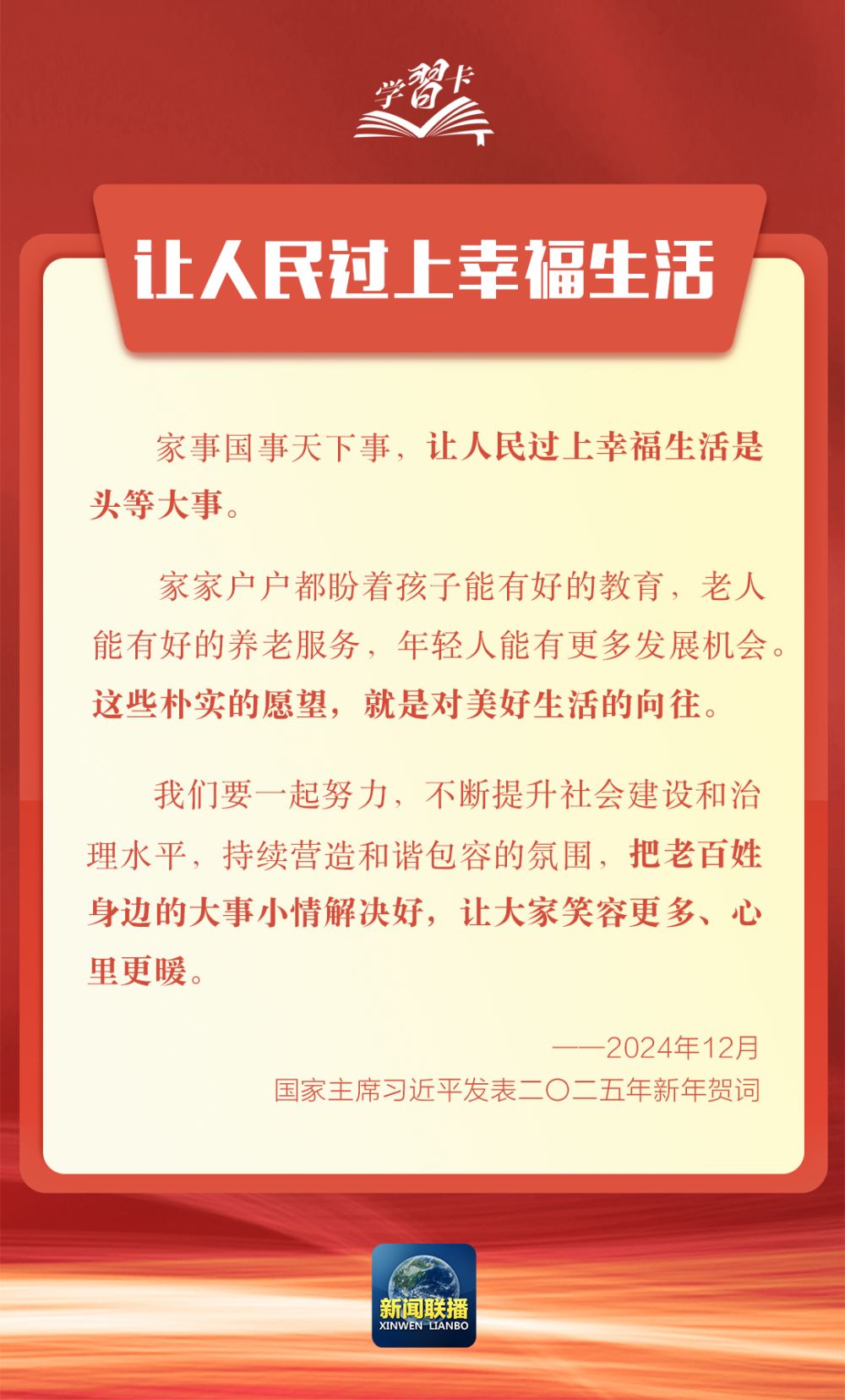 每逢新年前夕,习近平主席发表新年贺词,为亿万人民点赞、为每一位奋斗者加油鼓劲。重温这些直抵人心、催人奋进的话语,让我们满怀信心、奔赴新征程。