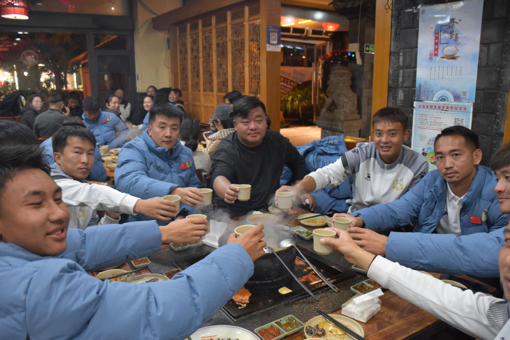 炭火噼啪作响,陶锅咕嘟冒泡,腊排骨的咸香与土鸡的鲜醇交织弥漫。普洱队的队员们一边品尝地道风味,一边连连称赞。队员朱源坤感慨道:“跨年夜本就想家,感谢丽江的暖心安排,让我们在异地他乡找到了家的温暖,这份热情比火塘更暖。”