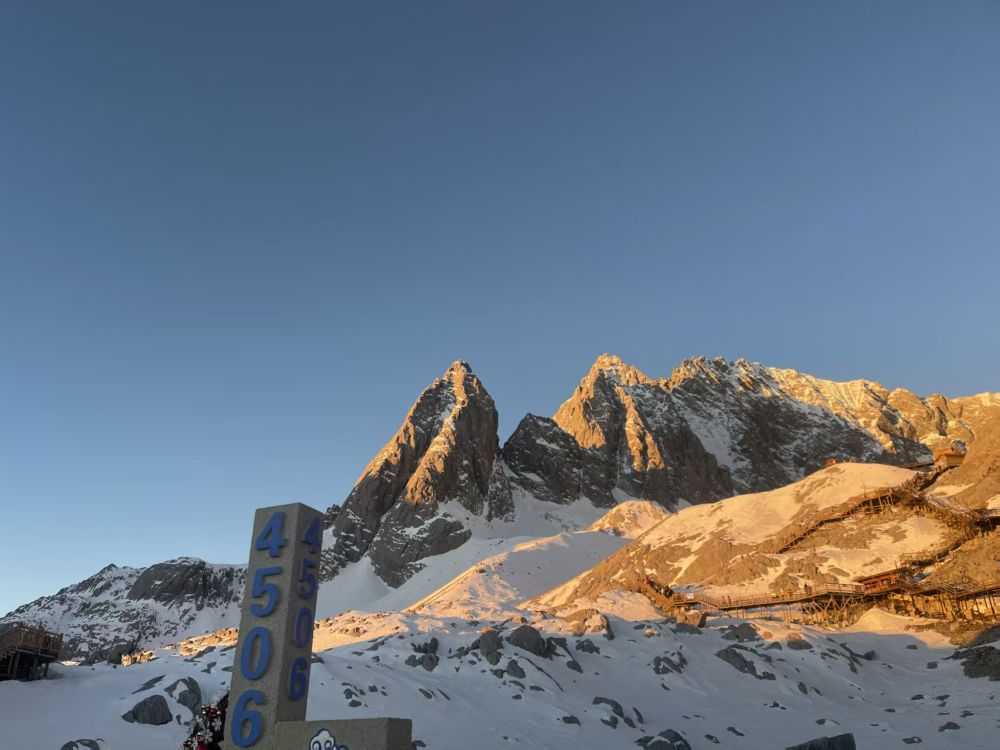 玉龙雪山在阳光照耀下仿佛被唤醒的巨龙,鳞甲在晨光中流转生辉。(玉龙雪山管委会质检中心 周晓岚 摄 )