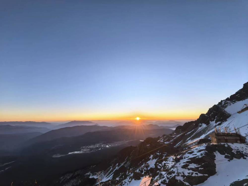 东方天色渐亮,一道金光穿透云层,在黛青色山巅晕染开橘红光影。随着太阳缓缓升起,光芒洒落玉龙雪山最高峰扇子陡,皑皑雪峰瞬间流光溢彩,宛如巨龙苏醒,鳞甲熠熠生辉。