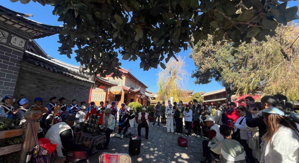 银发映暖阳,指尖淌古音。悠扬的纳西古乐漫过五花石板路,老人们的慈祥笑容与美丽服饰相映成趣。他们把纳西族的文化底蕴,唱在古调里、穿在服饰上,让游客收获颇丰。