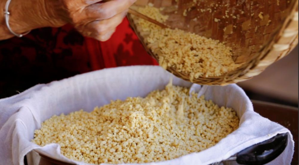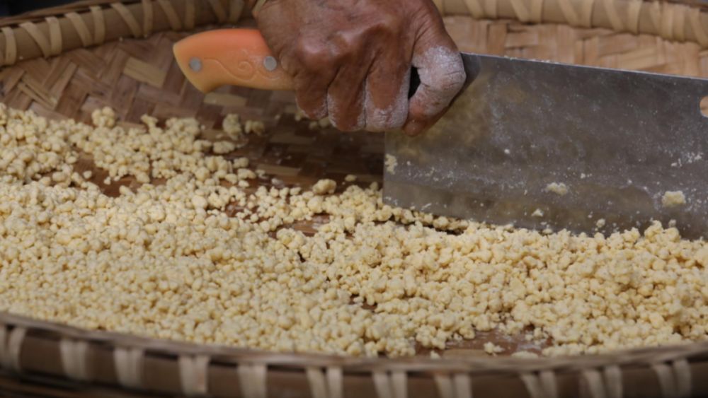 “打面果儿”的精髓,全在一个“打”字,生动概括了制作过程的力道与辛劳。湿面、簸面、剁面、滚面,四道工序全凭双手与簸箕的默契相守。竹簸箕轻旋颠簸,湿润的玉米面在“唰唰”声中聚形、滚圆,菜刀轻剁修匀,再经慢滚上粉,每一粒都浸透着老手艺人的力道与耐心。同蒸的“面果儿”与米饭,一黄一白,玉米浓香裹挟着米香,蒸熟后配上一碟酸腌菜、一勺豆豉酱,粗粝中透出谷物本身的清甜,朴素而暖胃暖心。