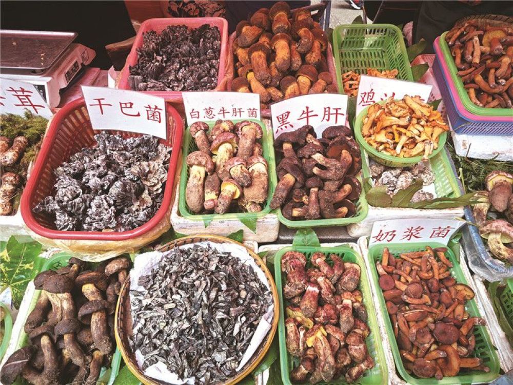 篆新农贸市场里售卖的各种野生菌和春菜 大观篆新农贸市场 供图