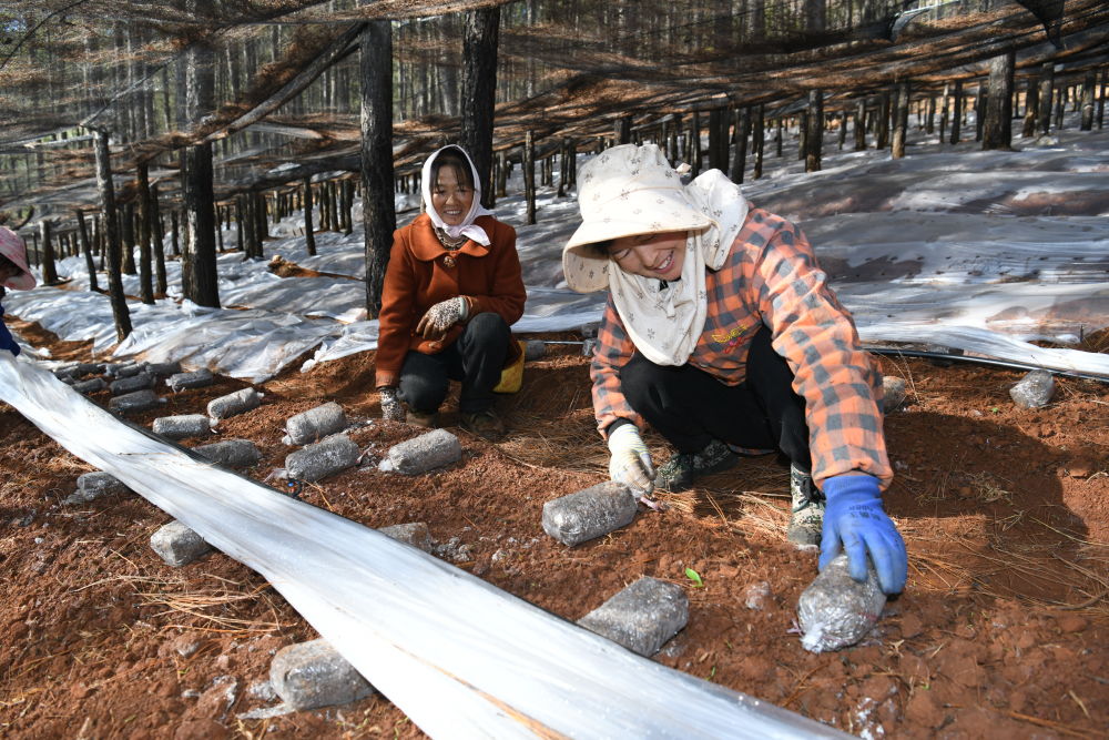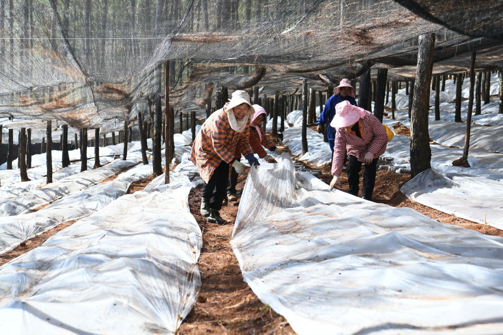 罗忠菊(左一)和村民忙着为菌床覆盖地膜。(丽江融媒记者 赵庆祖 摄)