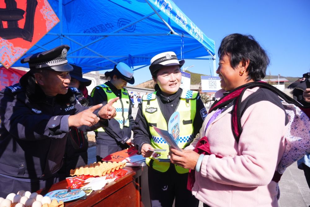古城区委政法委和区法学会的工作人员,正用纳西谚语诠释着《中华人民共和国民法典》中宅基地、赡养等相关条款的精神内涵。在丽江市公安局的摊位前,民警们举着手机,屏幕上显示着“国家反诈中心”App的下载页面。“大叔,你看,这样点开‘来电预警’,就像给手机穿了个‘盔甲’。”在另一边的展板前,几名警官正在给村民解释“一盔一带”的案例。