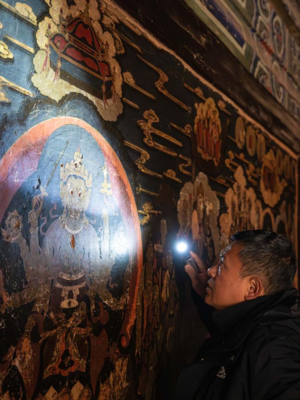 1月16日,杨志坚(左)与同事在白沙壁画博物馆查看大宝积宫的壁画。