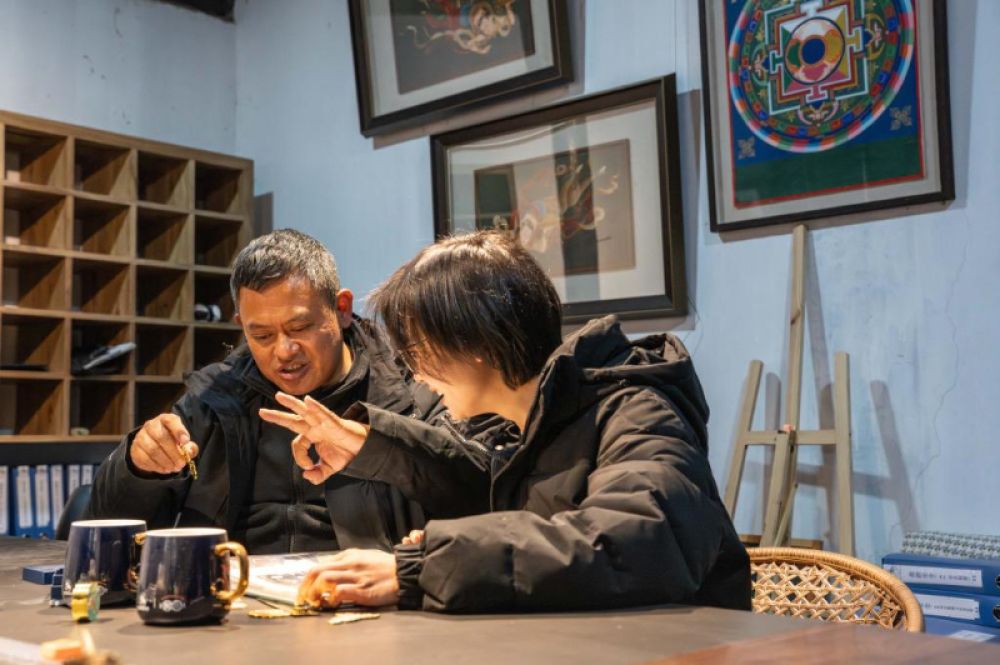 1月15日,杨志坚(左)与同事讨论白沙壁画文创产品设计。