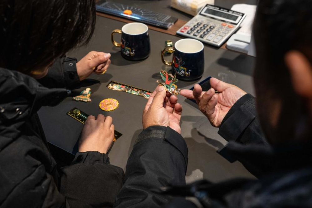 1月15日,杨志坚(右)与同事讨论文创产品设计。