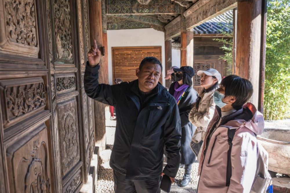 1月14日,杨志坚(左)在白沙壁画博物馆为游客介绍古建筑。