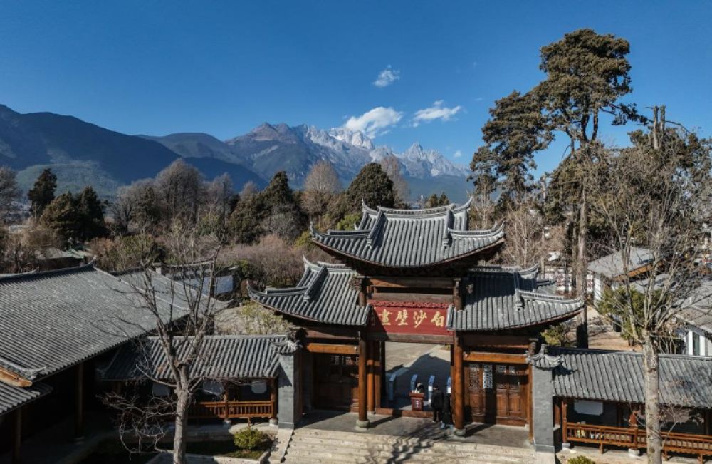 1月15日在云南省丽江市白沙镇拍摄的白沙壁画博物馆和远处的玉龙雪山(无人机照片)。