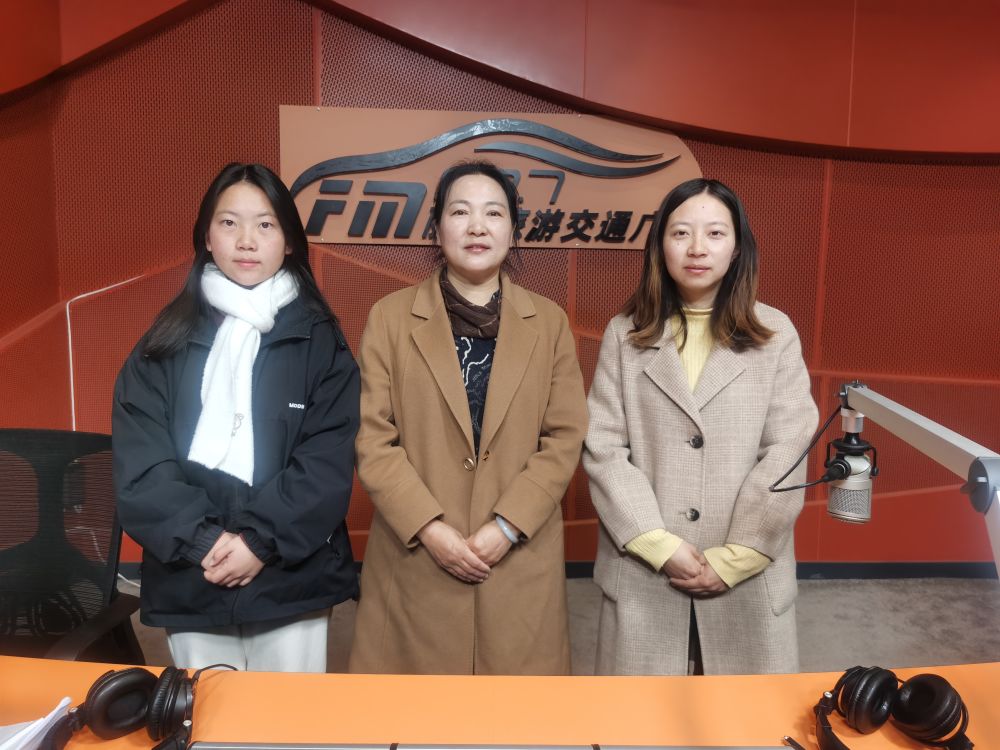 古城区图书馆文化传承项目负责人陈朝萍(中)及志愿者代表唐春(左)、和晓元(右)做客丽江旅游交通广播。(丽江融媒记者 李婧 摄)