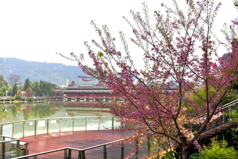 “三河六岸”的晨光,总先吻醒那百余株冬樱。沿着亲水栈道蜿蜒铺开的花枝,将粉红的烂漫揉进清澈的河水中,倒映出“云霞落溪涧”的诗意画卷。脚踏温润的木质步道,身旁花枝缀满繁花,微风拂过,粉瓣簌簌飘落,似冬雪般轻舞却藏着暖意。得益于云县“冬无严寒、夏无酷暑”的低纬高原季风气候,这里的冬樱较国内大部分地区早绽两三月,成为滇西冬日独有的“粉色地标”,吸引着游人循着花香奔赴而来。