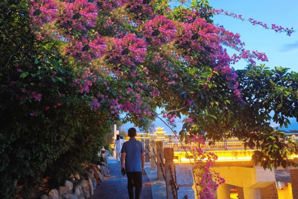 藏在栈道小径旁的三角梅,以最浓烈的热忱对抗深冬萧瑟。肥厚的翠绿叶片间,绯红、紫红的花团缀满枝头,或攀着河畔护栏顺势蔓延,或倚着青石板阶扎根生长,将浓烈色彩泼洒在清冽河岸。花瓣与流水相映,像一团团跳动的火焰,不仅驱散了冬日寒意,更藏着云县人骨子里的热烈与坚韧,为“三河六岸”添上一抹极具生命力的亮色。