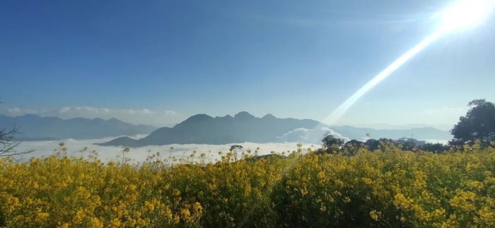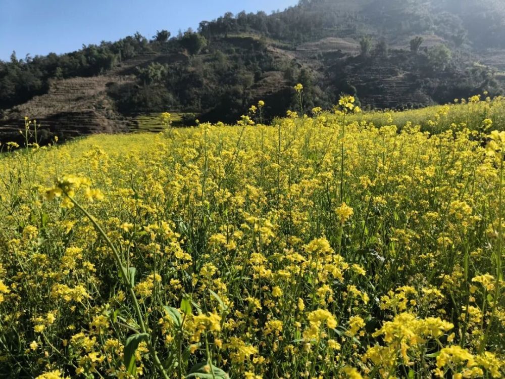 阳光穿透薄雾,为大朝山西镇的山野和田野披上金色外衣。当前,全镇1000余亩油菜花正值盛花期与结果期交替时节,梯田间金黄的花海连绵不绝,构成了一幅生动的田园山水图景。